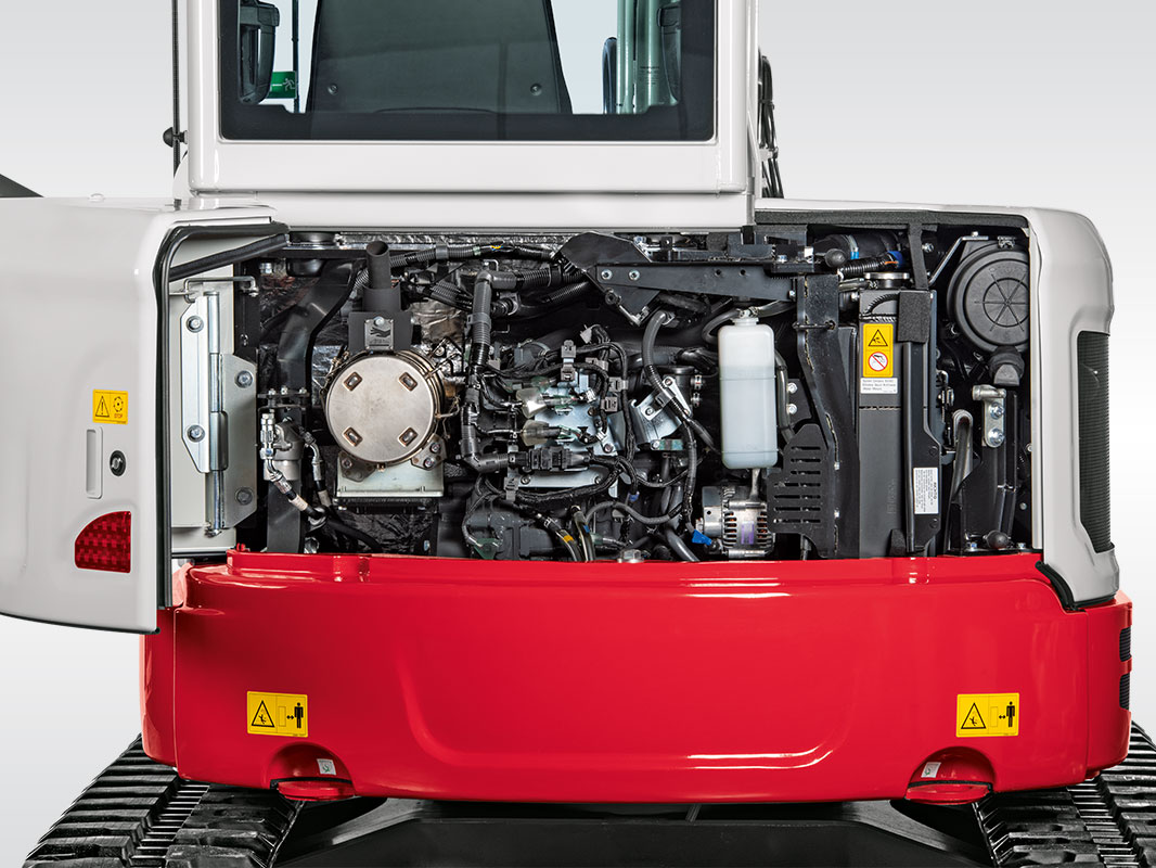 Der TB 350 R besticht vor allem durch sein Kurzheck. Sein Oberwagen ragt kaum über die Laufwerke hinaus und auch die geöffnete arretierte Tür befindet sich innerhalb des Schwenkradius.